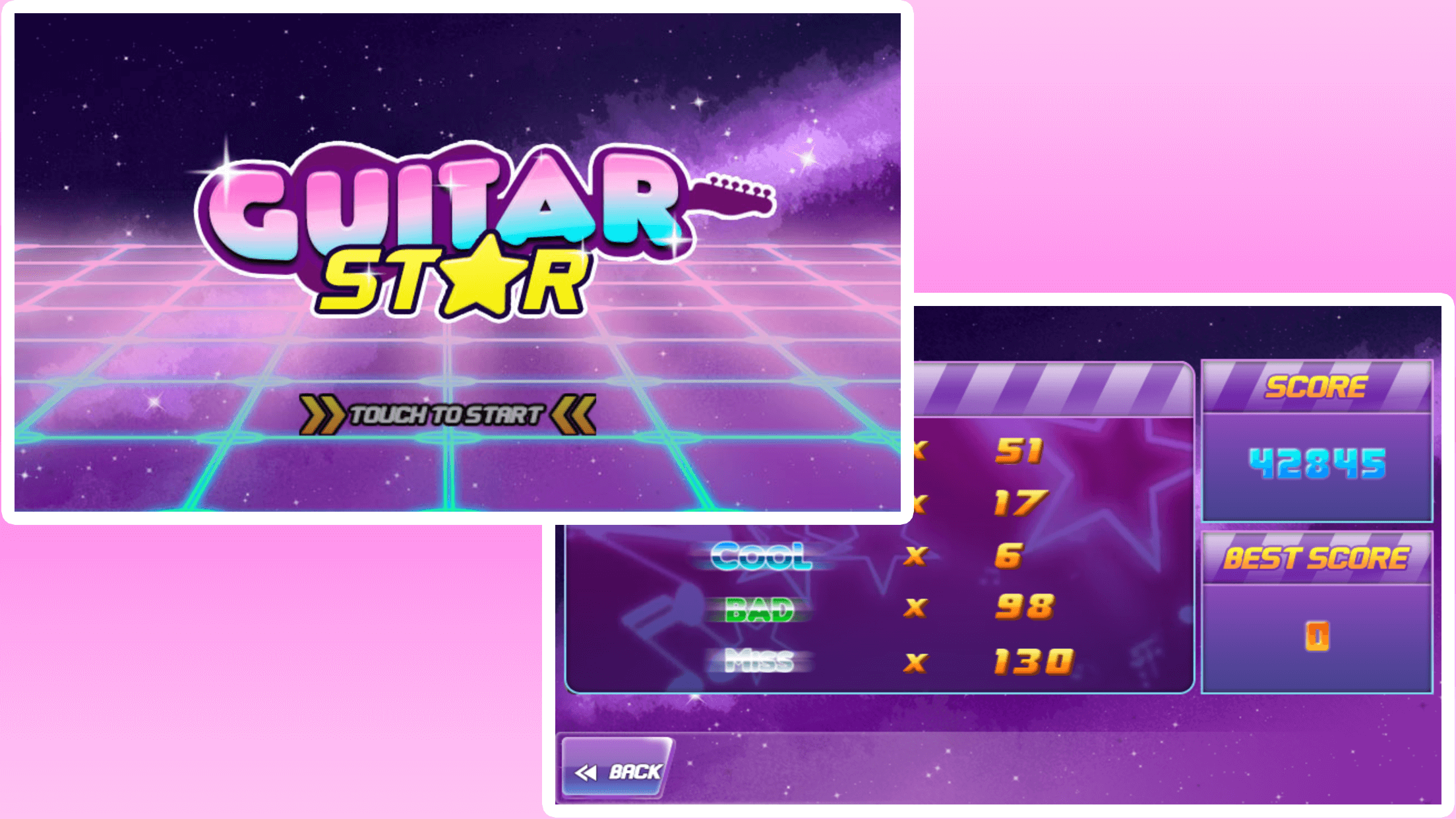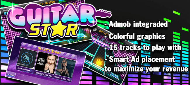 Guitar Star inspired by the Guitar Hero game, the notes match the beat of the music so when you play the game you will feel so excited. The more perfect you score, the more point you get. The game can easily extend by adding more tracks and modify the txt files. Colorful graphics match music style game. Great sound effects. Many tracks to try. Score more point to challenge your friends. Combo system with many type of status like Great, Bad, Miss, Perfect There are 4 buttons at the bottom of the screen Touch them when the bar move down and overlap them Touch the button in the right time to score Perfect Two or more continous Perfect will score more point and make it a combo. Demo APK: https://drive.google.com/file/d/12G63neyEipYLRo5oS3qNthx8N3LAm0Qy/view?usp=sharing Features – Admob intergrated – Support Unity 2020.3.3 – Easy to re-skin and rebuild with detailed document you just need to change Admob ID and the game is ready to build – Require Unity 2020.3.3f1