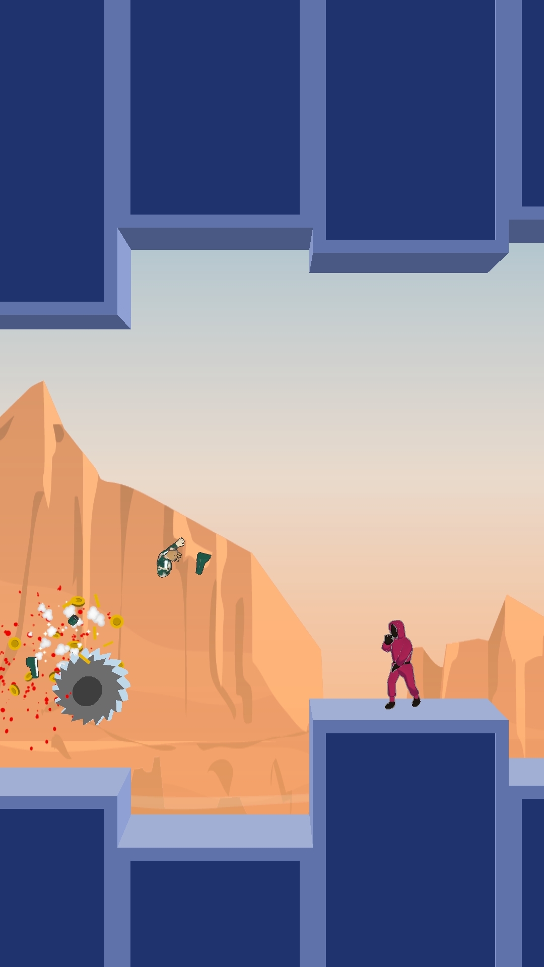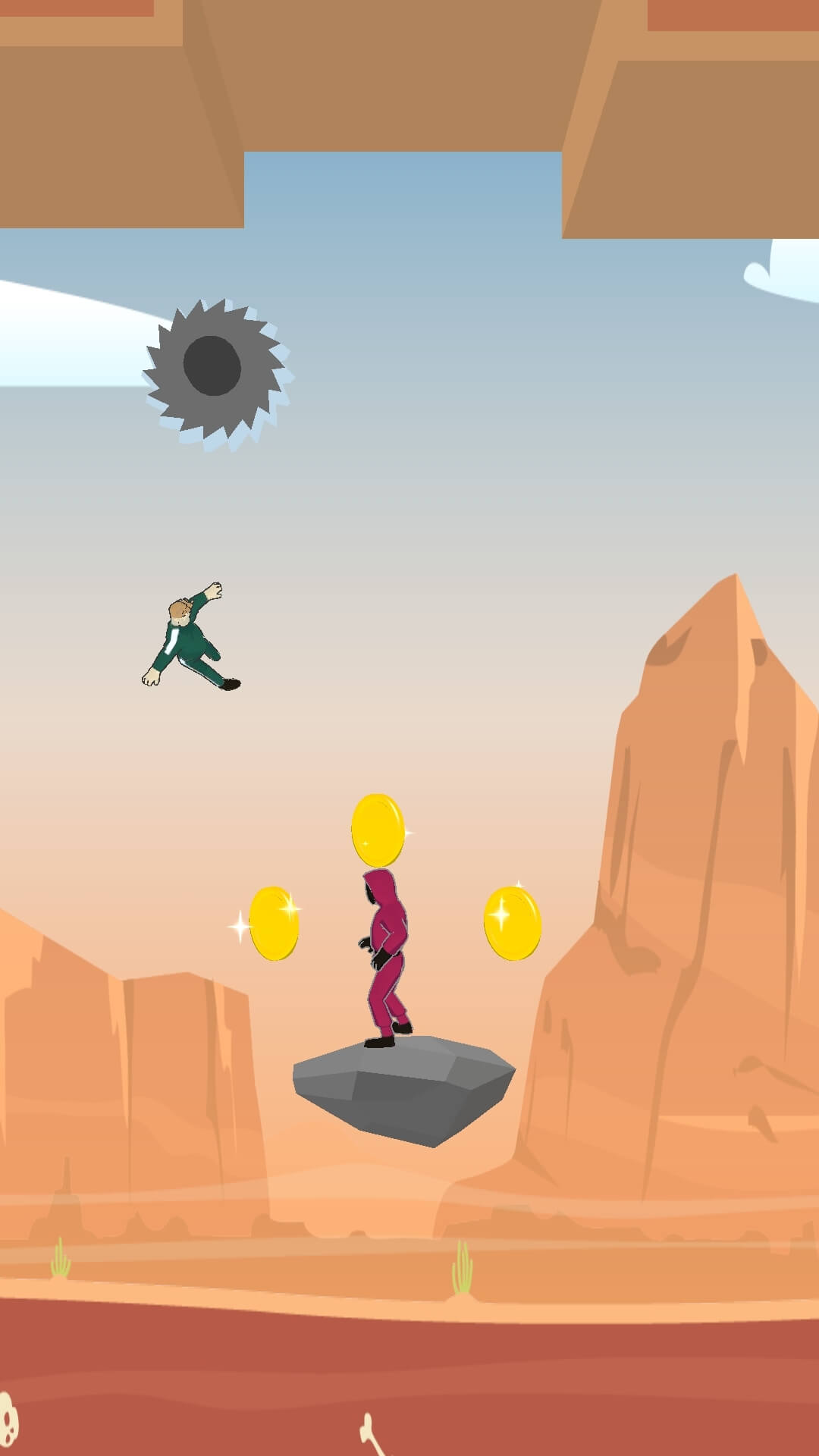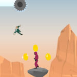 Avoid saws and stones, collect coins and shoot down enemies.