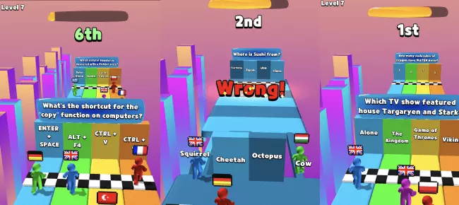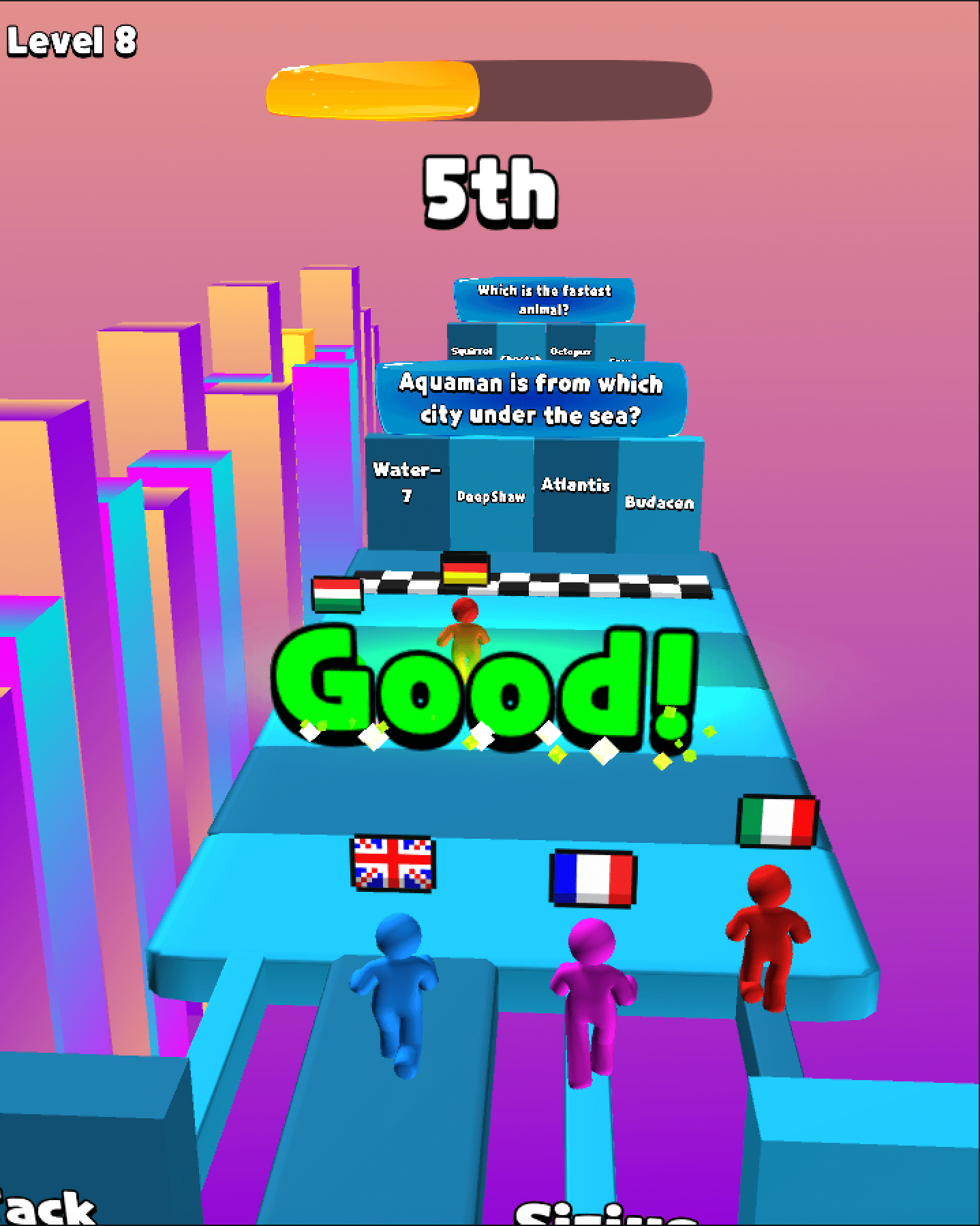 Original Hyper Casual game to conquer the top of the market! Be the fastest, answer the questions well. (If you choose a wrong answer you will be slowed down.) 60+ Questions already added, easy to add infinitely more. (Adding questions is extremely easy, you can add it with 1 line of script. You can find tutorial on how to add questions in the Documentation)  The game was inspired by already successful games, mixing hyper casual running games with Quiz games. The game is original, be the first who publishes it!  Chest Manager System, fill the chest by winning matches and gain coins from it.  Country Leaderboard, race with the ai controlled other countries. Beautiful main menu with dancing guys  Quality Customer Spport If you have any problems with the game we are here to help you. Features Minimalist, beautiful desgn Hyper Casual gameplay Chest Manager Country Leaderboard AI opponents Documentation included